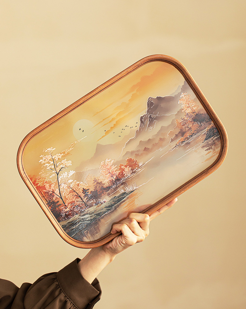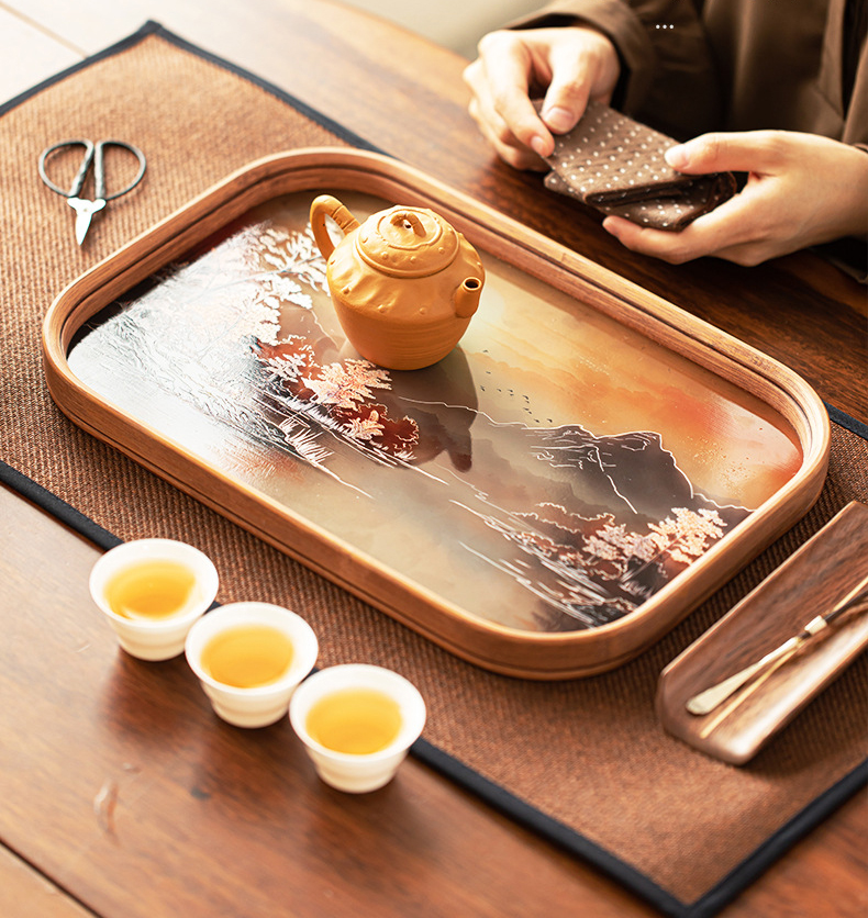 KHAY TRÀ THUỶ TINH VIỀN GỖ HOẠ TIẾT SƠN THUỶ
